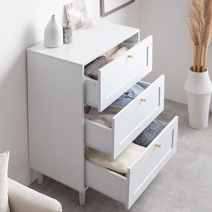 シャンパンゴールドの取っ手と引き出しの框(かまち)デザインがアクセントになったチェスト。