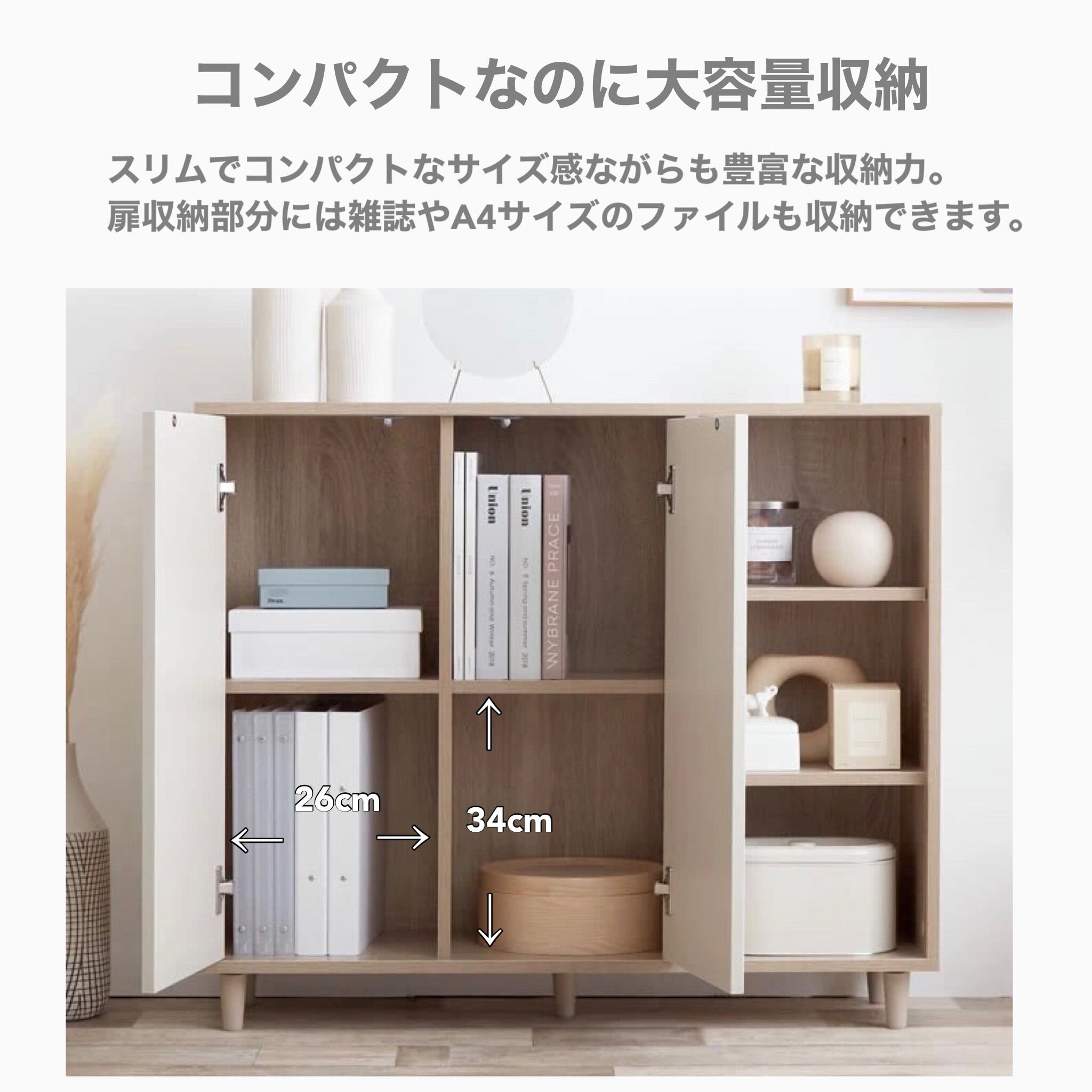 柔らかい木目調のナチュラルと明るいグレージュの組み合わせがお洒落な雰囲気を醸し出すバイカラーキャビネット。