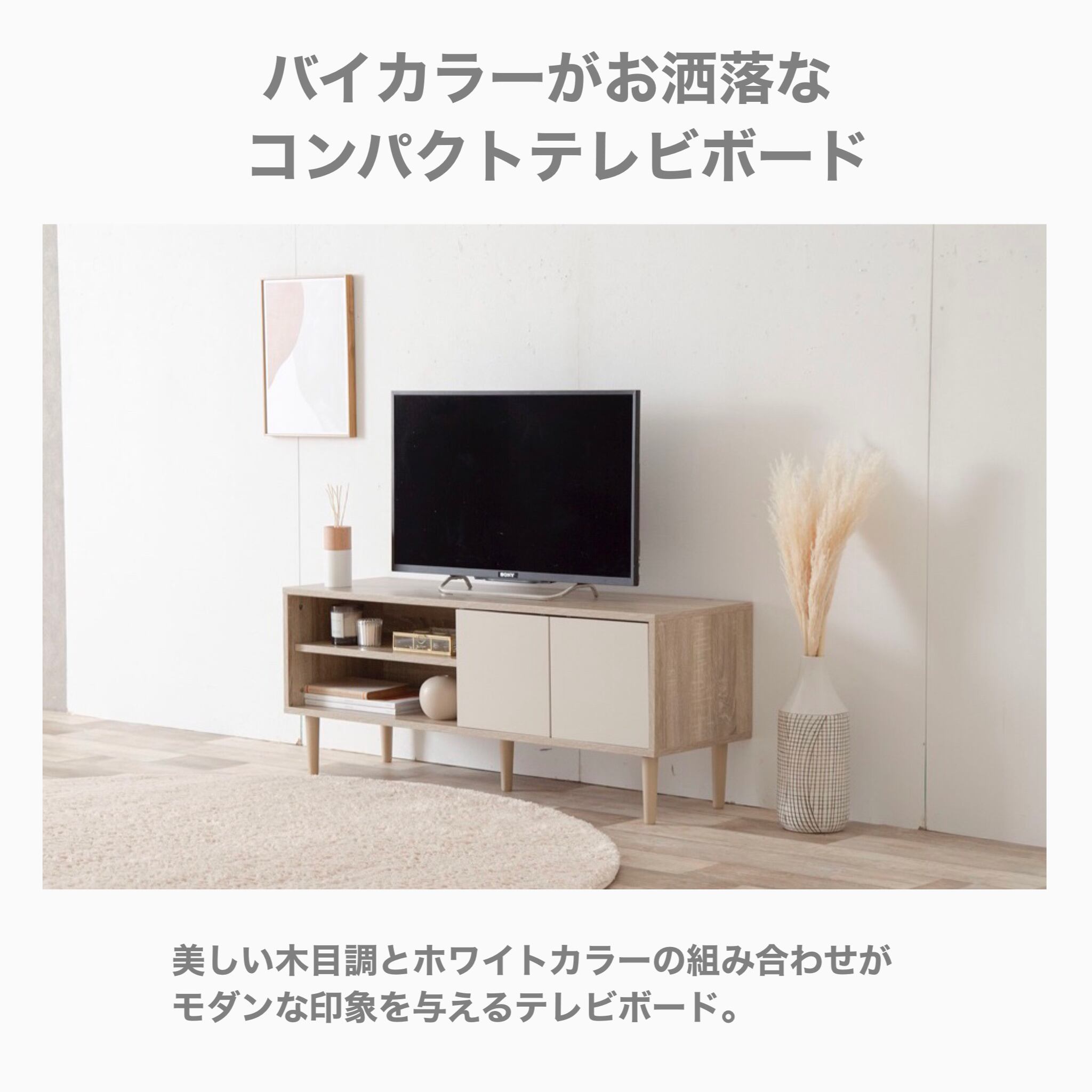 柔らかい木目調のナチュラルと明るいグレージュの組み合わせがお洒落な雰囲気を醸し出すコンパクトテレビボード。