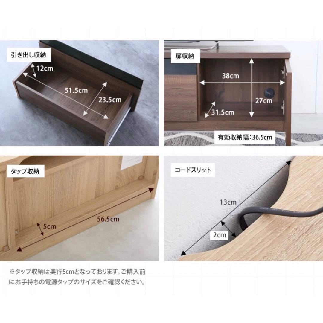 テレビ周りの小物をすっきり収納できるスライドレール付きの引き出しや、配線も考慮された設計となっておりスタイリッシュな見た目と機能性を兼ね備えたデザイン。