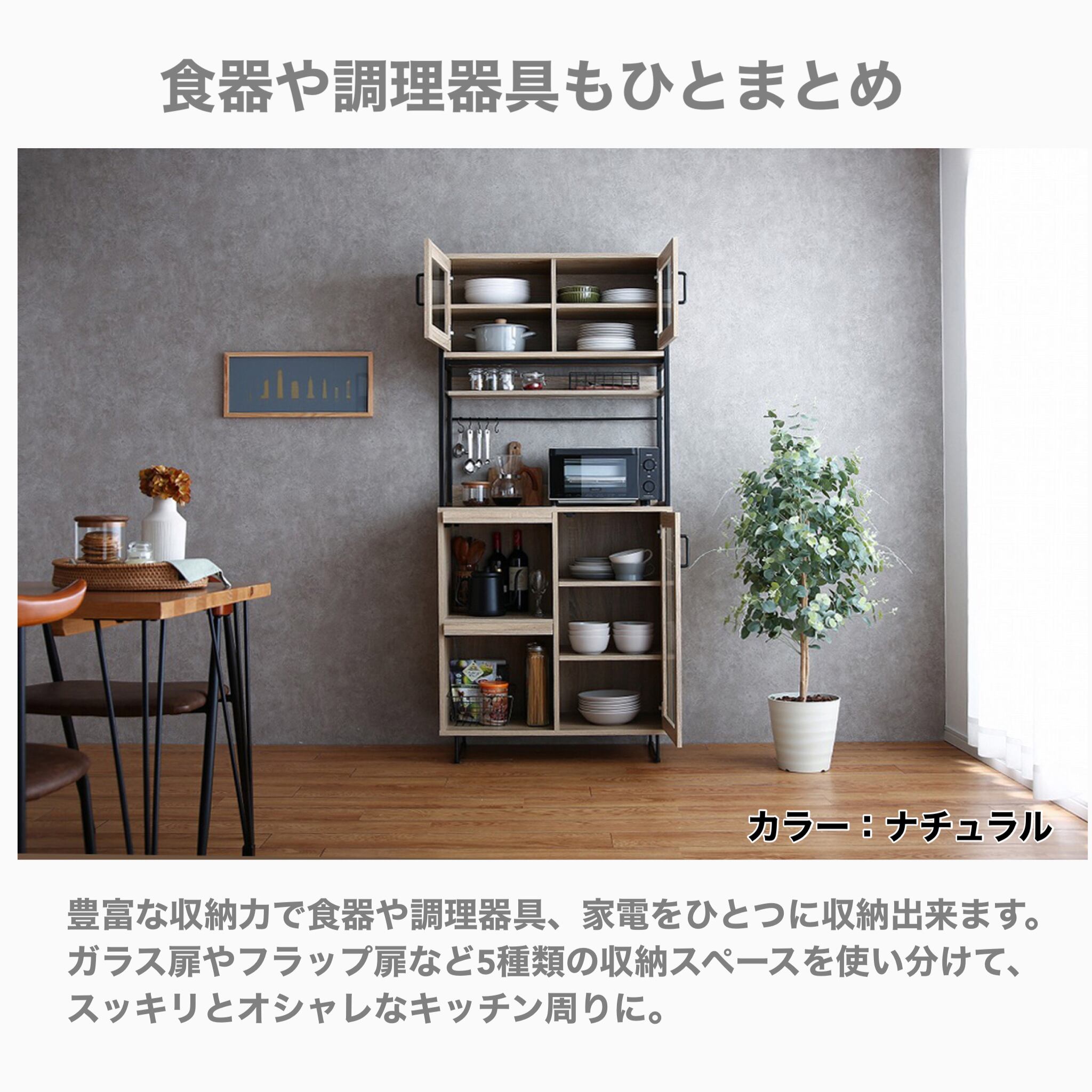 1台で食器や調理家電をまとめて収納できるガラス扉・フラップ扉付き食器棚。