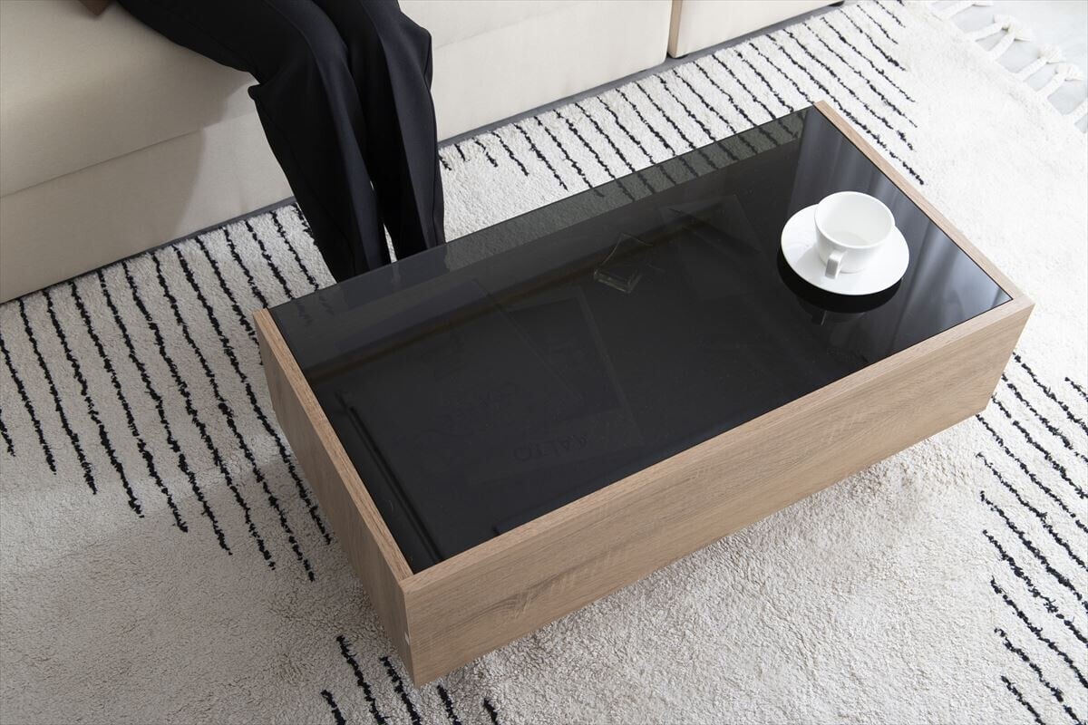 シックで透明感のあるブラック天板ガラスと味わい深い美しい木目調の組み合わせが高級感漂うデザイン。