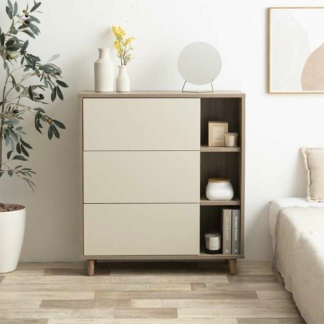 美しい木目調×アイボリーのバイカラーが特徴の棚付きチェスト。