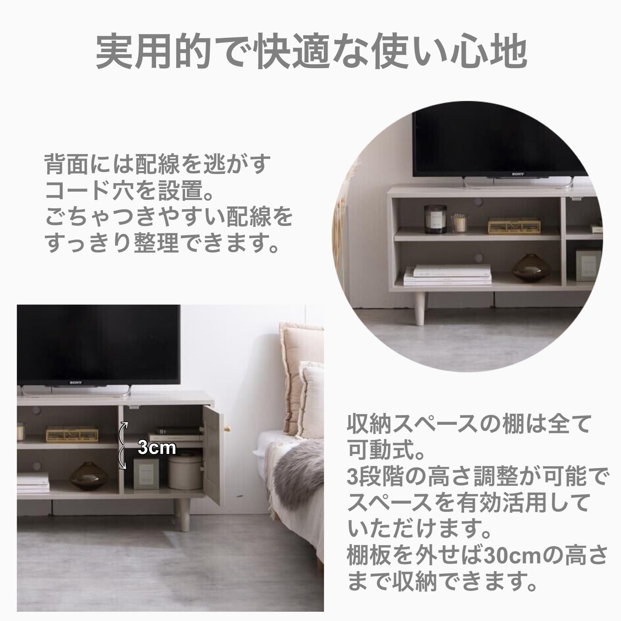 オープン収納・扉収納ともに可動棚を搭載。